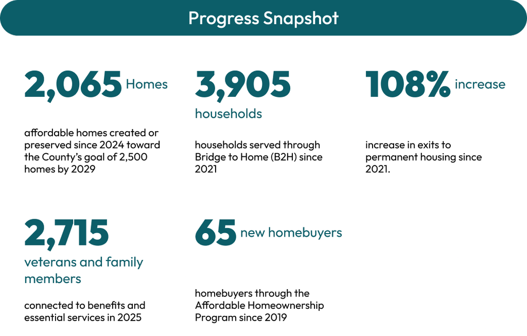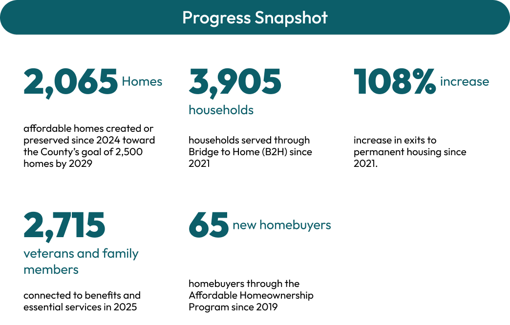 At the same time, these efforts directly advance the County’s Strategic Plan, ensuring that every investment in housing contributes to larger countywide goals. This work reflects a whole-department approach, with all five divisions working in alignment toward housing stability and affordability.