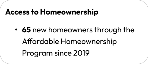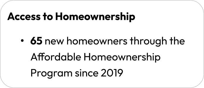 - Increasing the supply of affordable homeownership opportunities through strategic partnerships with local community land trusts, homebuilders, and the continuation of the Affordable Homeownership Program