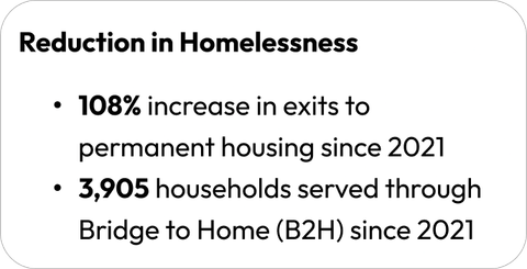Since 2021, Bridge to Home (B2H) has served 3,905 households, increased exits to permanent housing, and reduced returns to homelessness. The program operates in partnership with 11 community agencies to deliver coordinated services that support housing placement and long-term stability.